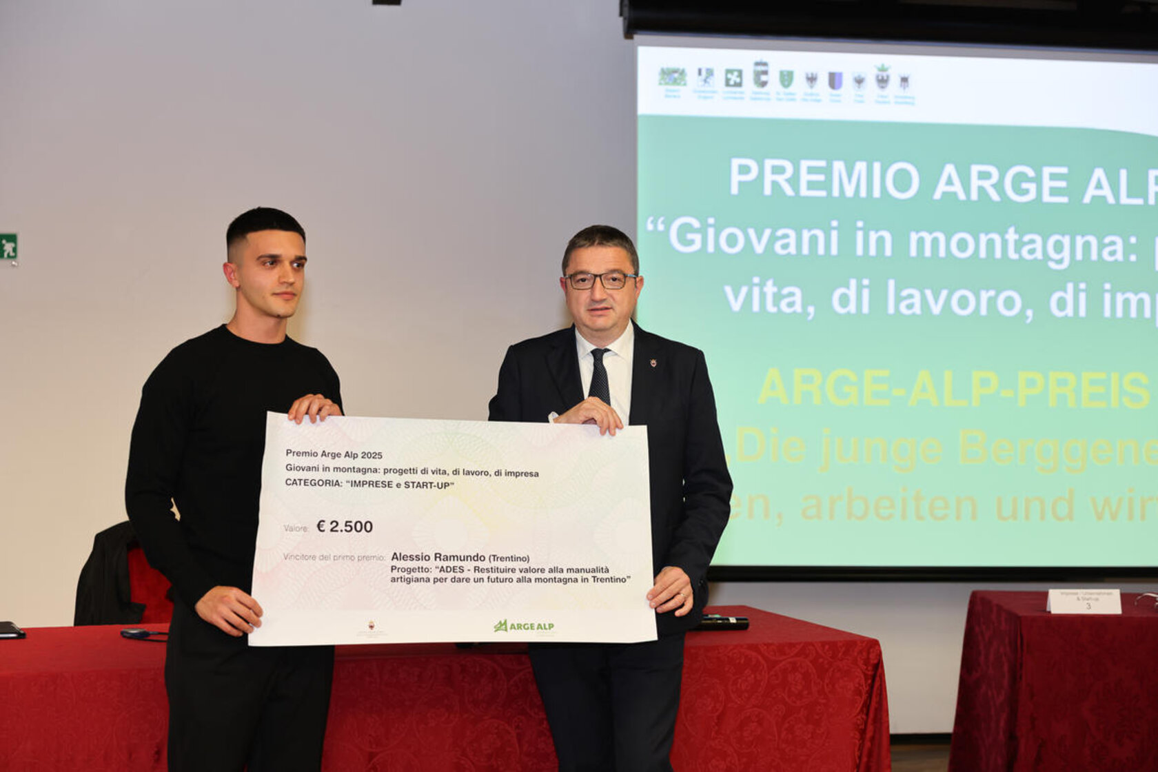 In der Kategorie Unternehmen und Start-ups ging der erste Preis (2.500 Euro) an das Projekt „ADES – Restituire valore alla manualità artigiana per dare un futuro alla montagna in Trentino” (ADES – Der Handwerkskunst wieder Wert verleihen, um den Bergen im Trentino eine Zukunft zu geben) aus dem Trentino, das von Alessio Ramundo vorgestellt und von Präsident Fugatti ausgezeichnet wurde. Das Projekt fördert die Herstellung von Möbeln und Gegenständen aus Holz und Leinen, die mit traditionellen Techniken und natürlichen Materialien hergestellt werden, und wertet die Beziehung zwischen jungen Menschen und Handwerksmeistern auf. Die Jury würdigte die strategische Übereinstimmung mit den Zielen des Preises und die Fähigkeit, Tradition, Nachhaltigkeit und Innovation zu verbinden.