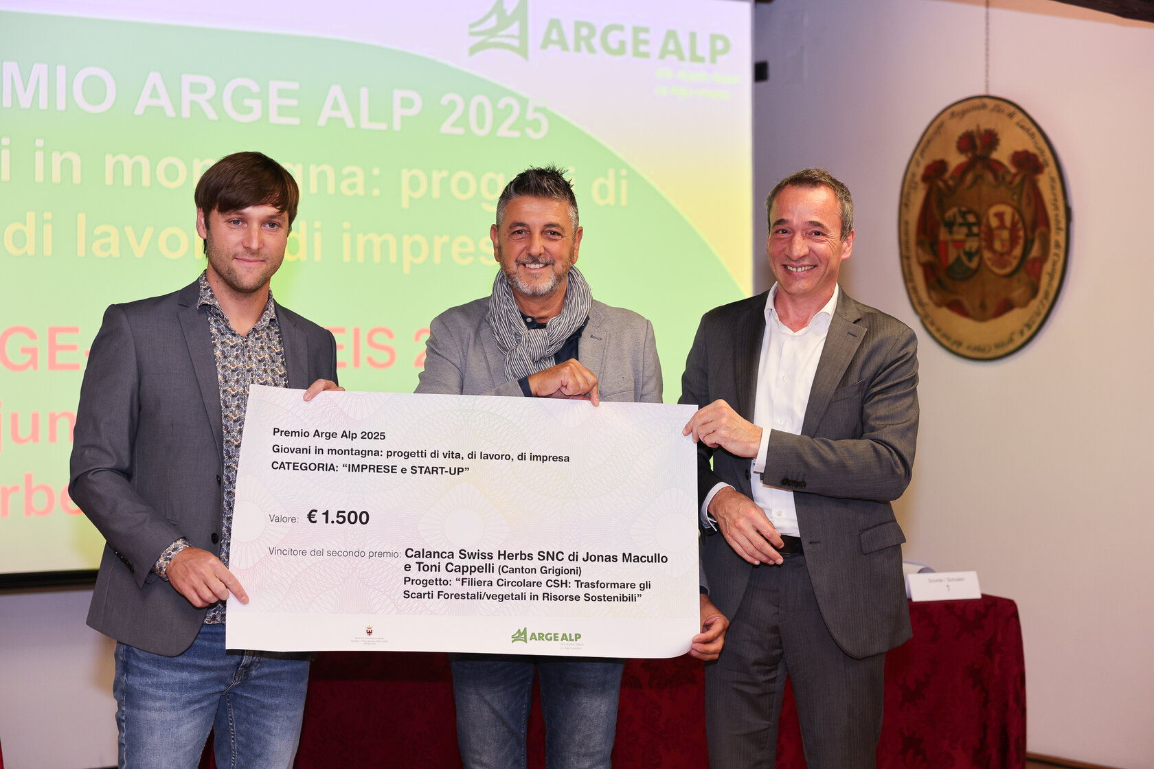 Der zweite Preis (1.500 Euro) ging an die „Calanca Swiss Herbs SNC” von Jonas Macullo und Toni Cappelli (Kanton Graubünden) für das Projekt „Filiera Circolare CSH: Trasformare gli scarti forestali/vegetali in risorse sostenibili” (CSH-Kreislaufwirtschaft: Umwandlung von Wald- und Pflanzenabfällen in nachhaltige Ressourcen), das vom Graubündner Regierungsrat Martin Bühler ausgezeichnet wurde. Das Projekt wertet Wald- und Pflanzenbiomasse durch ein kaskadierendes Betriebsmodell auf, das das wirtschaftliche, ökologische und soziale Potenzial erhöht. Die Jury würdigte die Fähigkeit, Umweltschutz, Energieeinsparung und nachhaltige Bewirtschaftung natürlicher Ressourcen zu verbinden.