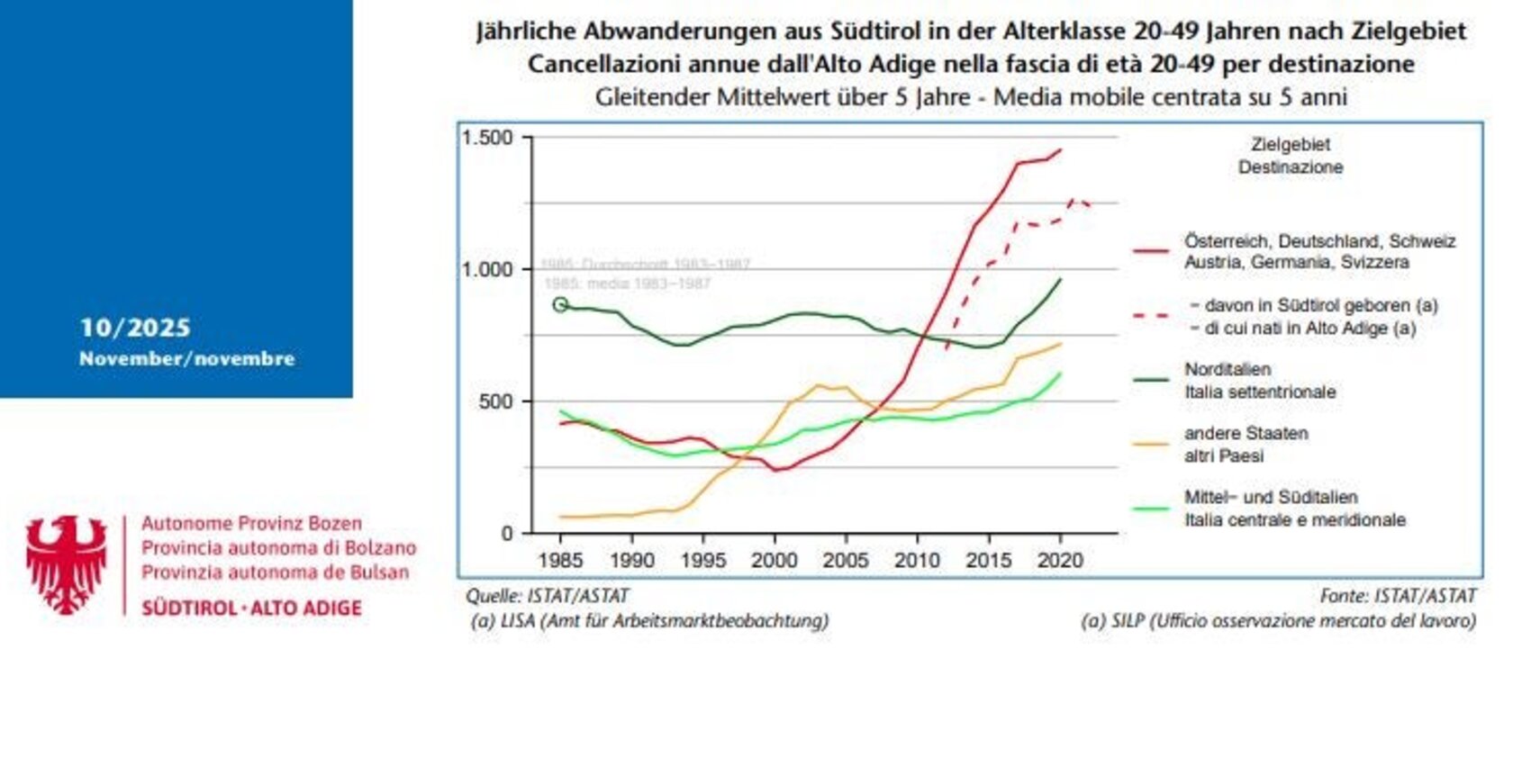 BOZEN (LPA). Der Trend ist klar: Immer mehr junge Menschen mit guter Ausbildung verlassen Südtirol – häufig in Richtung Österreich, Deutschland oder Italien: „Vor 15 Jahren sind in einem Fünfjahreszeitraum noch höchstens 1.500 Südtiroler und Südtirolerinnen der Altersgruppe 20 bis 49 Jahre in eines der deutschsprachigen Nachbarländer ausgewandert; inzwischen sind es rund 7.000 Personen“, erläutert Stefan Luther, der Direktor des Arbeitsmarktservice Südtirol.