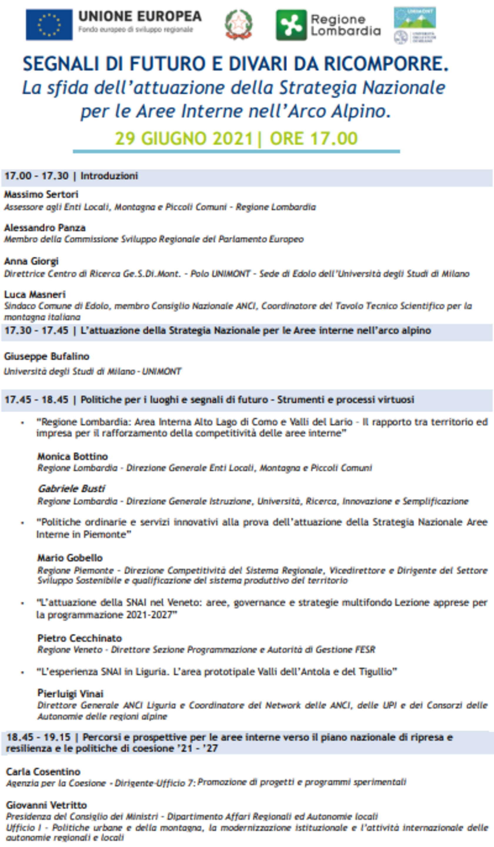 Am 29. Juni fand im Rahmen des Abkommens zwischen UNIMONT, CRC Ge.S.Di.Mont. - Universität Mailand und Region Lombardei - eine wichtige Tagung zum Thema „In-Wert-Setzung der Bergregionen“ statt. Die Tagung bot eine hervorragende Gelegenheit zum Austausch über die Umsetzung der Nationalen Strategie für die inneralpinen Gebiete auf italienischem Territorium. Es war ein "horizontaler“ Austausch zwischen Gebietskörperschaften und Vertretern der betroffenen Gebiete und ein „vertikaler“ Austausch zwischen Zentral- und Regionalregierungen und den Einheimischen, die tagtäglich in diesen Regionen leben und arbeiten.