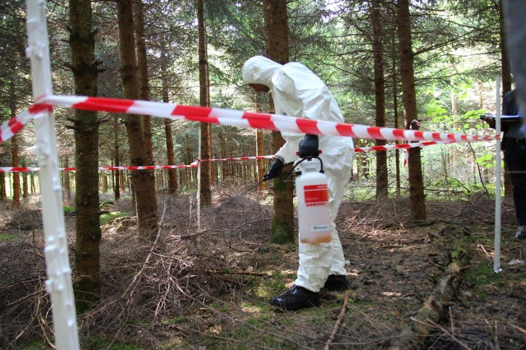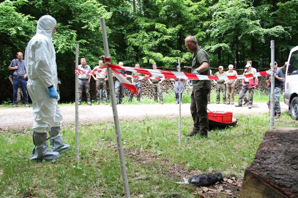Alle 8 del mattino si è raccolta la squadra di ricerche, composta dai dipendenti dell’Ufficio per la caccia e la silvicoltura nonché da membri della società venatoria locale e dell’Ufficio di controllo veterinario di Oberbüren, che ha preso in consegna le istruzioni della direzione operativa di intervento. La ricerca ha avuto inizio nel bosco di Bischofszell. I 24 partecipanti hanno costituito una catena e hanno setacciato il bosco settore per settore. Dopo ogni ritrovamento è stato informato il direttore operativo, che ha proceduto a circoscrivere il perimetro, indossare l’attrezzatura di protezione, fare dei rilevamenti sulle carogne, disinfettare il luogo del ritrovamento e recuperare le carogne. Nel giro di tre ore è stata così perlustrata una superficie di ca. 18 ettari; sono stati ritrovati complessivamente sei dei sette preparati e carogne nascoste. Successivamente si è tenuta una dimostrazione del team di cani da seguito sotto la guida di Hans Döbeli, della Comunità di Lavoro svizzera per i cani da seguito per PSA. I due Labrador addestrati hanno mostrato in modo esemplare come fossero in grado di ritrovare i preparati e di avvisare il padrone del loro ritrovamento. Infine le carogne sono state depositate presso il centro di controllo, dove le ha prese in consegna un veterinario per smaltirle in un container. Un veicolo della TMF Extraktionswerk AG è venuto a ritirarle e le ha portate a Bazenheid per l’incenerimento.