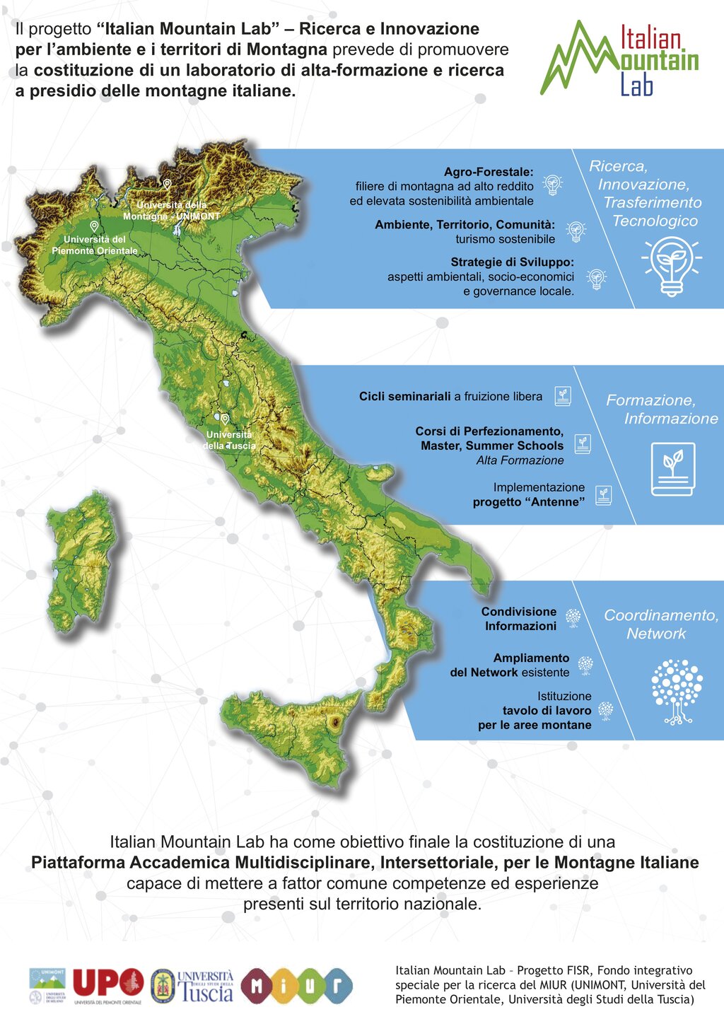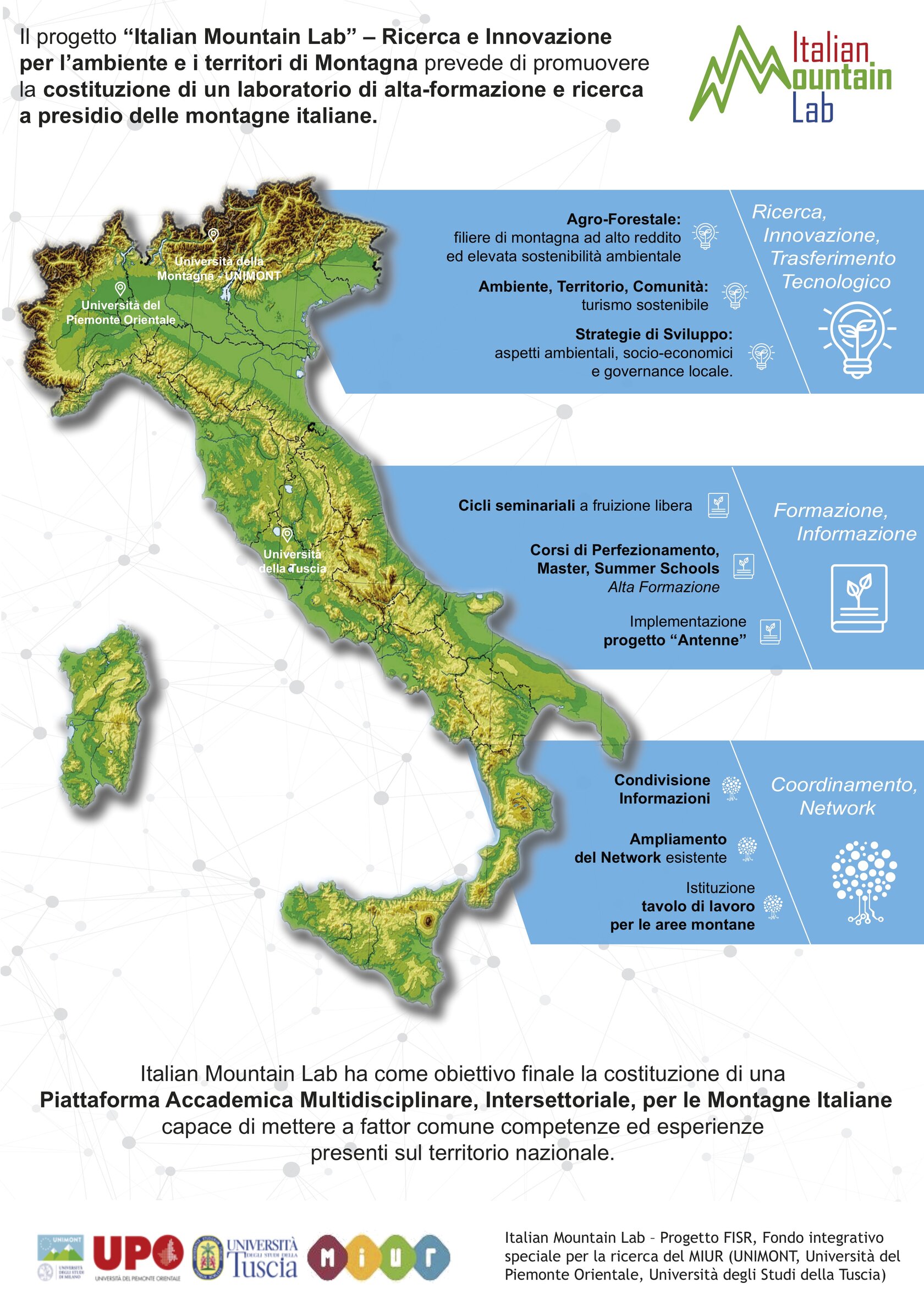 Il progetto " Italian Mountain Lab " - Ricerca e Innovazione per l’ambiente e i territori di Montagna” – finanziato attraverso fondi FISR (Fondo Integrativo Speciale per la Ricerca) del Ministero dell’Istruzione, dell’Università e della Ricerca - MIUR, si prefigge, capitalizzando l’esperienza dell’Università della Montagna – Polo di Edolo dell’Università degli Studi di Milano – centro di eccellenza che ha acquisito competenza ed esperienza nella ricerca, didattica, trasferimento tecnologico e networking in ambito montano, di potenziare gli sforzi e l’attenzione del mondo accademico italiano sulle necessità di ricerca, formazione e di collaborazione e coordinamento per lo sviluppo dei territori montani, in coerenza alle loro risorse e vocazioni. UNIMONT, attraverso il progetto sostiene attivamente la collaborazione tra università, soggetti pubblici e privati, tra i quali Regione Lombardia, per avviare attività di ricerca, formazione e disseminazione, specifiche per la promozione di uno sviluppo dei territori montani, congiunte per la costruzione, anche in Italia, di un sistema coordinato e cooperante sui temi montani, capace di mettere a fattor comune competenze ed esperienze, diffuso sul territorio nazionale.