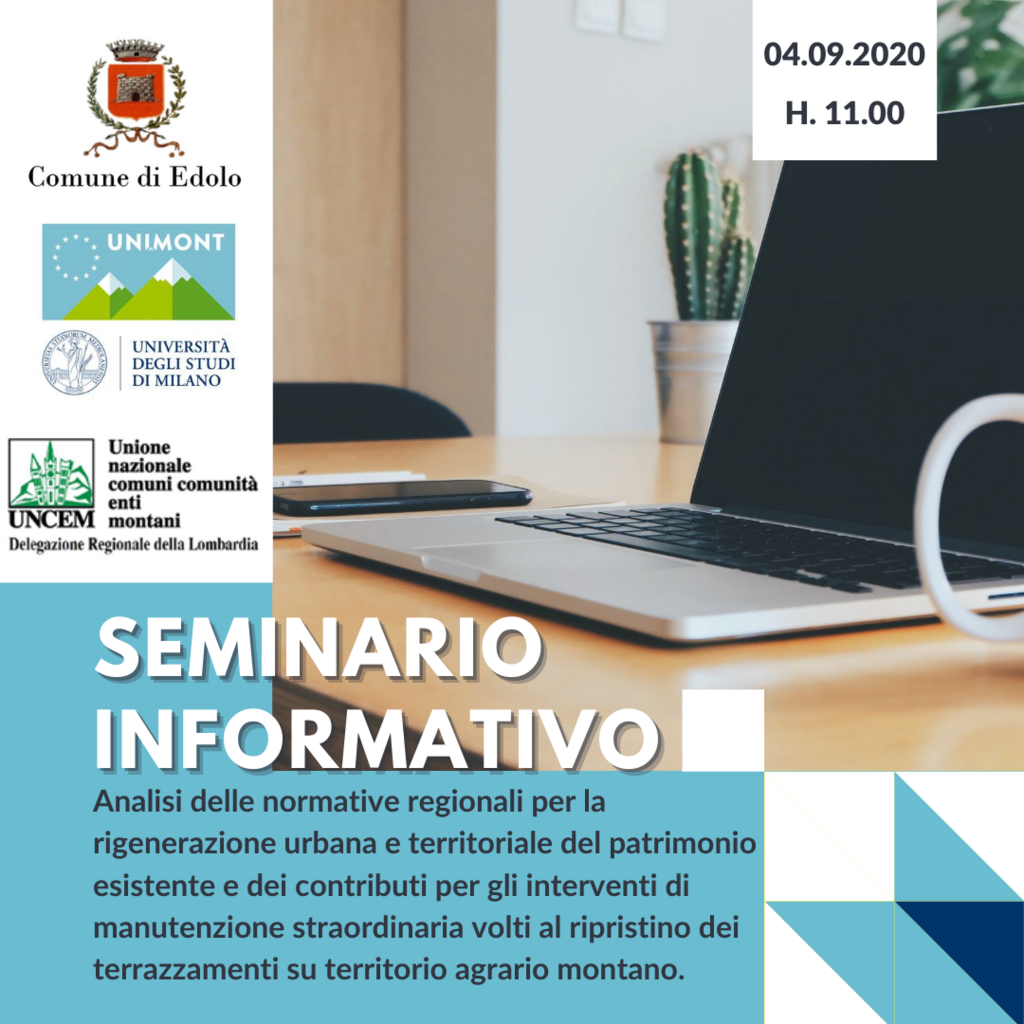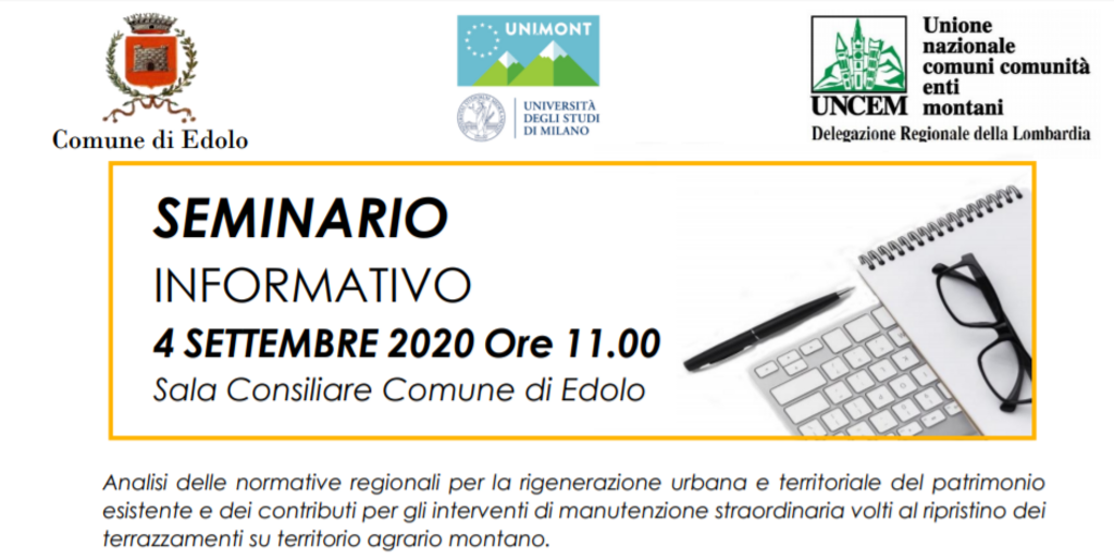 Queste importanti iniziative sono state diffuse pubblicamente durante il “Seminario Informativo sul consumo e rigenerazione del territorio montano lombardo. Opportunità per la valorizzazione territoriale” del quattro settembre 2020, svoltosi presso la Sala Consiliare del Comune di Edolo, con lo scopo appunto di informare gli amministratori, gli enti e i cittadini dei territori montani lombardi in merito ad alcuni utili strumenti che Regione Lombardia, sensibile al tema dello sviluppo delle aree montane, mette a disposizione per qualificare e valorizzare il patrimonio edilizio e il paesaggio rurale.