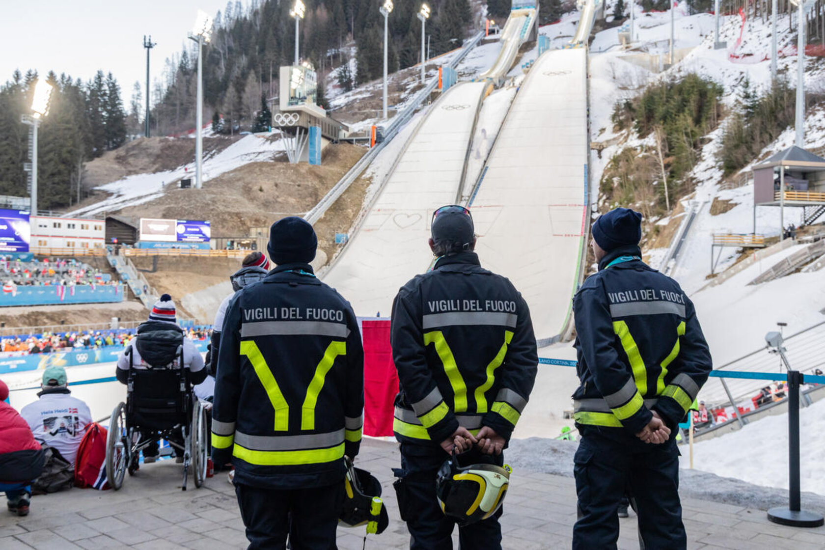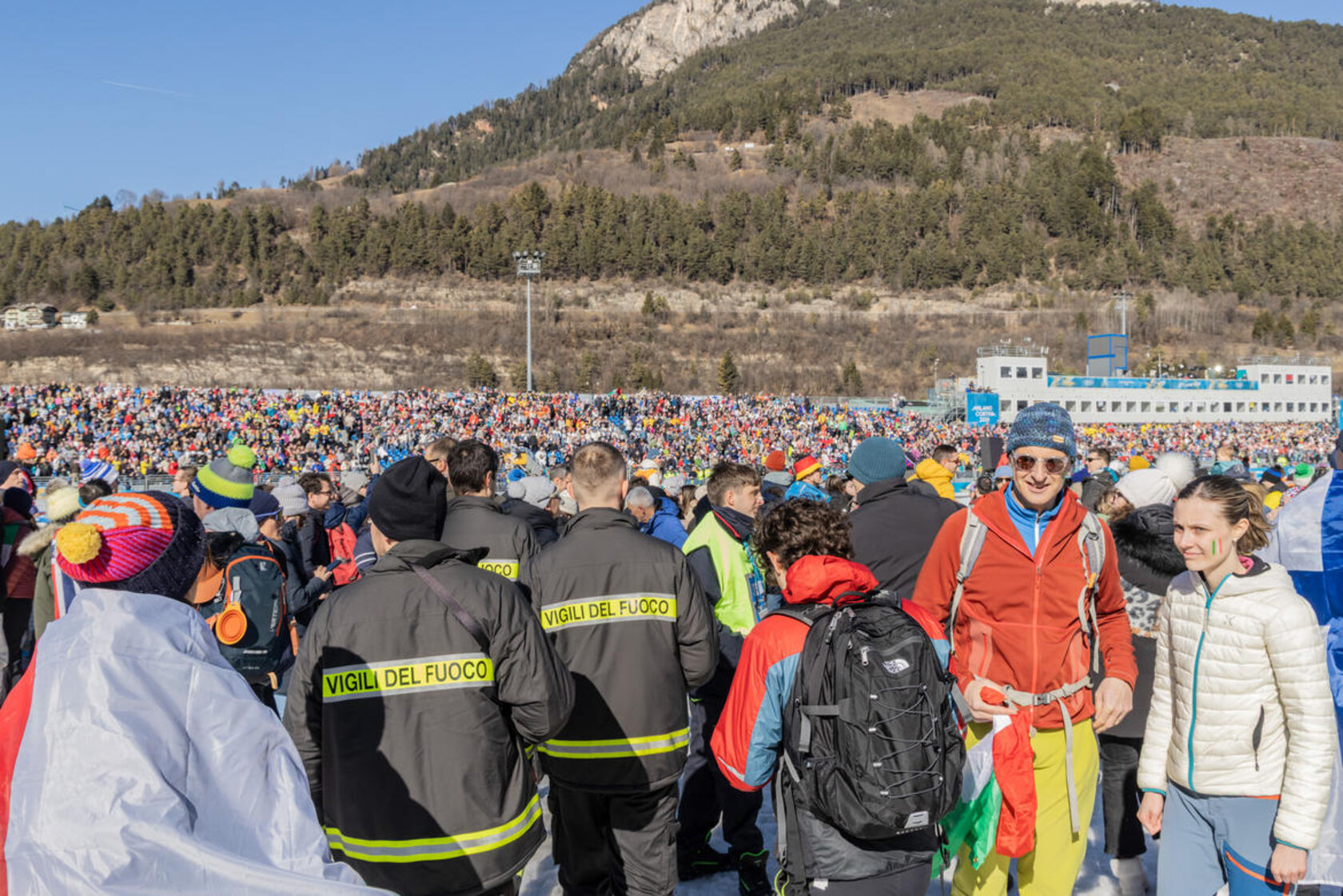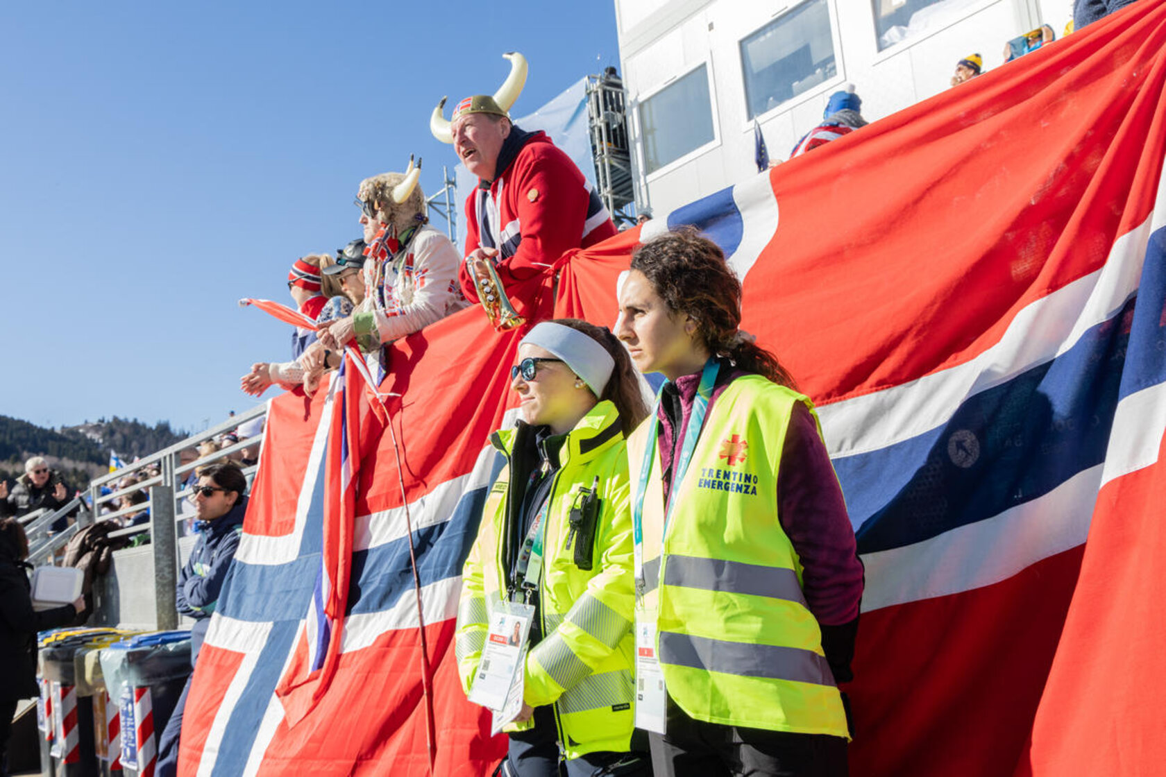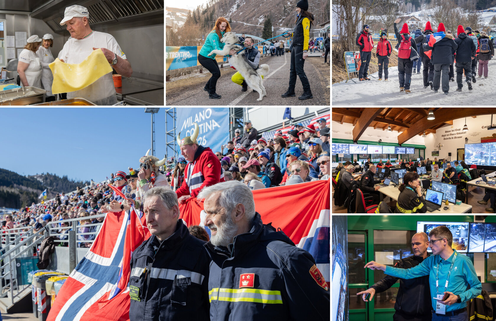 Lungo i percorsi di accesso alle aree di gara di Tesero e Predazzo le diverse componenti del volontariato presidiano il territorio. Le casacche riportano i loghi delle diverse strutture operative: Croce rossa italiana del Trentino, Federazione dei Vigili del fuoco volontari del Trentino, Psicologi per i popoli del Trentino, Scuola cani da ricerca e catastrofe di Trento, Soccorso alpino e speleologico del Trentino e Associazione nazionale Carabinieri del Trentino.