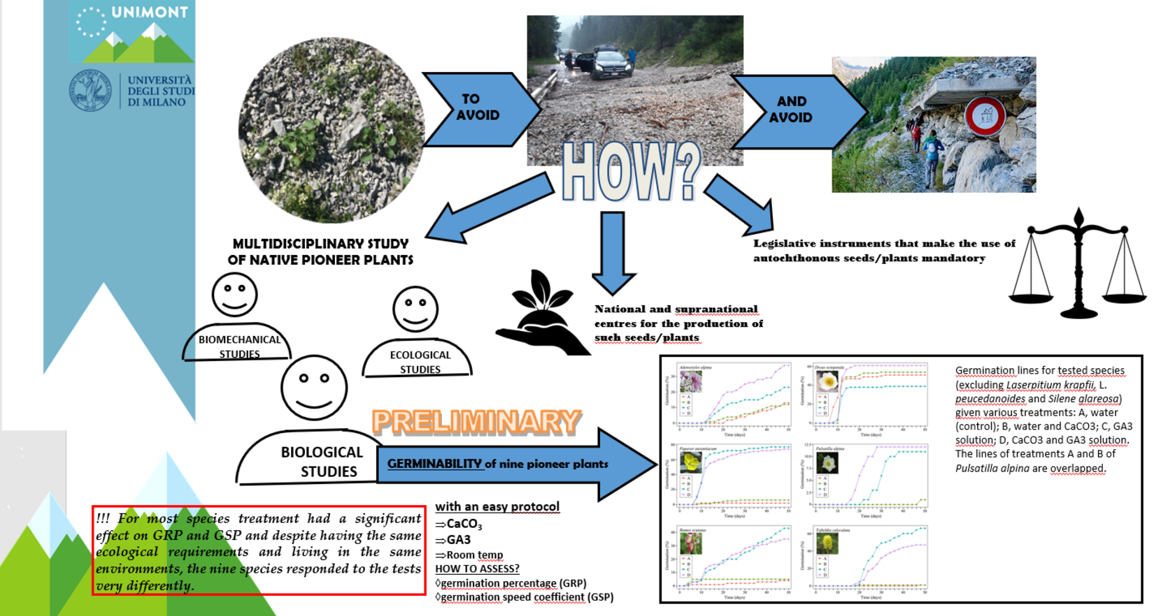 Gli interventi di stabilizzazione sono spesso difficili in questi siti, sia per l'impatto paesaggistico che possono provocare (con le prevedibili conseguenze sui flussi turistici) sia per la particolarità ecosistemica di queste aree: suolo molto povero, altamente basico a causa della presenza di roccia carbonatica e con intensa escursione termica. Le soluzioni di ingegneria naturalistica, ovvero l’utilizzo di organismi viventi e materiali eco-compatibili per la realizzazione delle opere di stabilizzazione, rappresentano un passo avanti rispetto ai tradizionali interventi di ingegneria idraulica minimizzando l’impatto paesaggistico e ambientale ma devono comunque essere realizzate in maniera molto oculata. I comuni “mix” commerciali di semi utilizzati in queste particolari tecniche ingegneristiche, infatti, contengono piante adatte ai pascoli di media montagna e che fanno un’estrema fatica a adattarsi all’ambiente dei ghiaioni oppure diventano all’opposto dei competitori della flora locale, con notevole danno al patrimonio della biodiversità montana. Recentemente è stata consigliata una serie di buone pratiche per i tecnici che progettano e realizzano opere di bioingegneria del suolo, oltre ad evidenziare alcune criticità che dovrebbero essere affrontate dai ricercatori al fine di aumentare il successo di tali lavori. Tra queste vi è lo studio biotecnico ed ecologico di "nuove" specie vegetali pioniere da impiegare nella bioingegneria del suolo che, oltre a stabilizzare il suolo, potrebbero accelerare le successioni vegetazionali spontanee rispettando quindi i meccanismi ed i processi che regolano gli ecosistemi. In questa ottica il centro di ricerca CRC Ge.S.Di.Mont. del polo distaccato UNIMONT dell’Università degli Studi di Milano ha iniziato lo studio (“Alpine Pioneer Plants in Soil Bioengineering for Slope Stabilization and Restoration: Results of a Preliminary Analysis of Seed Germination and Future Perspectives”) di queste piante a partire dalla loro capacità di germinare ex situ, ovvero al di fuori del loro ambiente naturale, per iniziare a contemplare l’idea del loro utilizzo negli interventi di stabilizzazione dei ghiaioni. Sono state testate nove piante alpine (Papaver aurantiacum, Rumex scutatus, Tofieldia calyculata, Pulsatilla alpina, Silene glareosa, Adenostyles alpina, Dryas octopetala, Laserpitium peucedanoides e Laserpitium krapfii) e alcune, come Dryas octopetala, hanno mostrato una elevata germinabilità anche senza l’aggiunta di fitormoni o sostanze particolari.